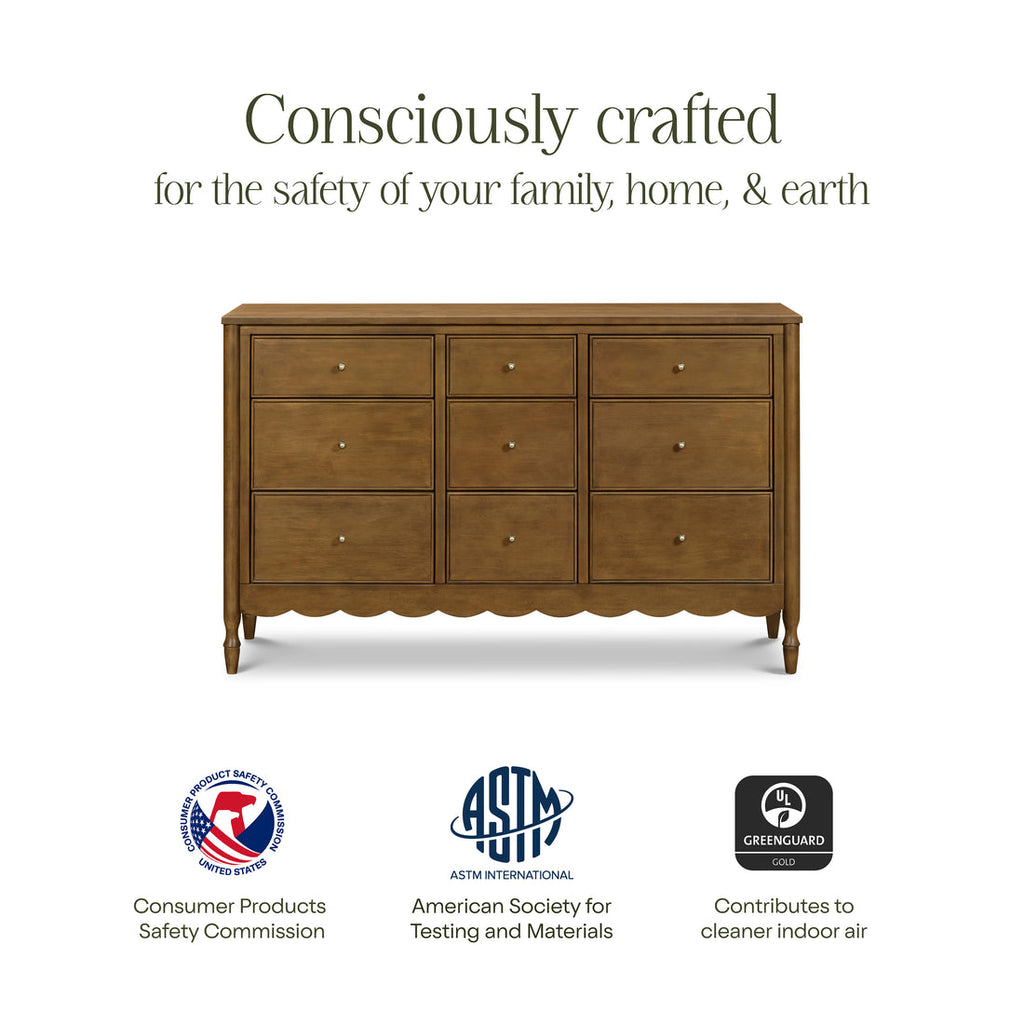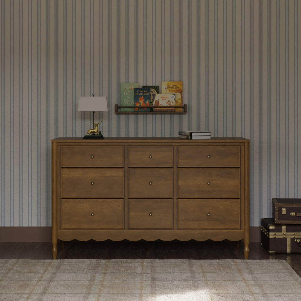 With its graceful curves and heirloom-inspired detailing, the Ambrosia 9-Drawer Dresser brings timeless elegance and generous storage to your nursery. The scalloped base and turned legs add a touch of romance, while nine spacious drawers keep everything beautifully organized from baby essentials to everyday favorites. Thoughtfully crafted to become a statement piece designed to grow with your home for years to come.