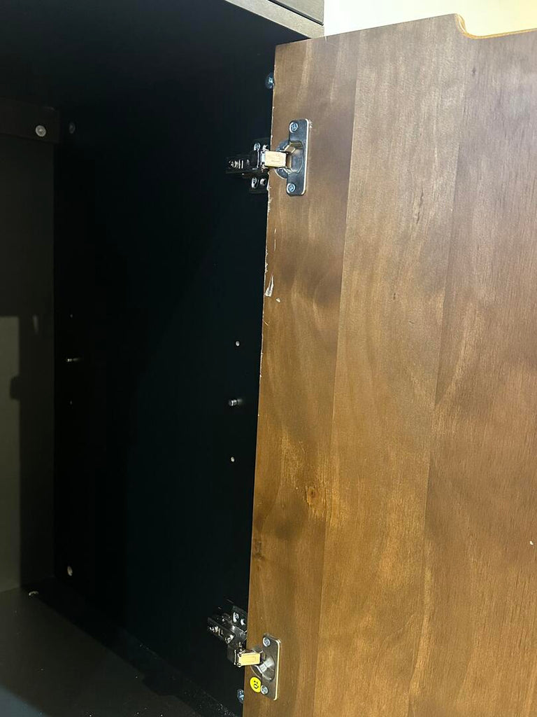 - 3 drawers with metal drawer glides and stop mechanisms, 1 cabinet with inner shelf