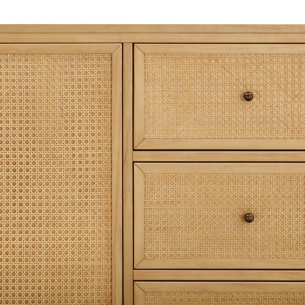 A perfect blend of classic charm and modern texture, the Marin Chifforobe features gently curved edges, solid cane panels, and spacious storage. With five drawers and a roomy cabinet with a hanging rod, it’s a stylish solution for keeping clothes and essentials organized from baby days and beyond.