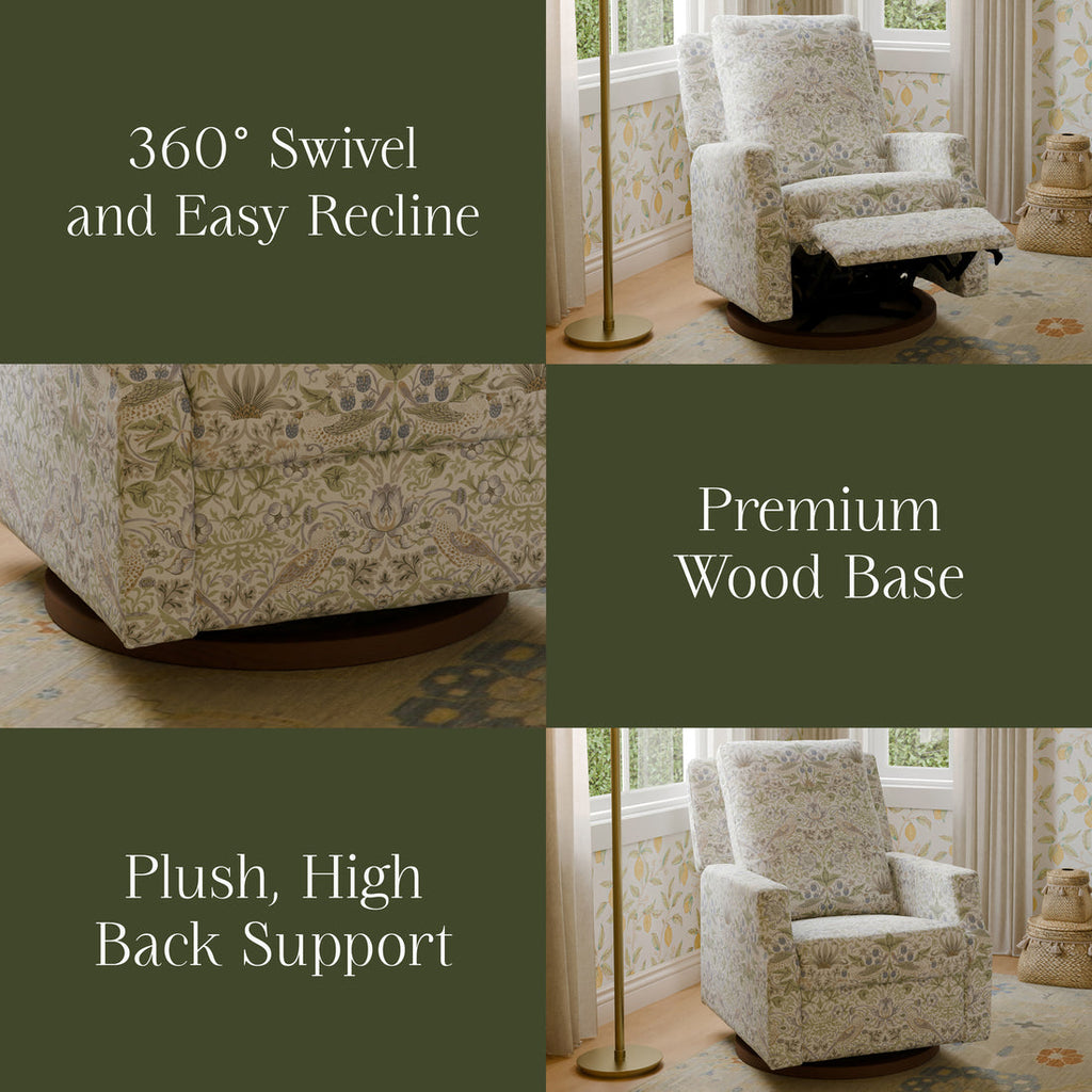 Rooted in the Arts and Crafts movement, Morris & Co. celebrates the beauty of the natural world, traditional craftsmanship, and hand-painted artistry. Our collaboration brings their iconic, richly layered prints to life on our bestselling Crewe Recliner and Swivel Glider. Featuring a crisp, contemporary design and comfortable seat, the Crewe Recliner is the perfect spot to soothe and share with your baby, with its smooth swivel & glide motion and manual recline feature.